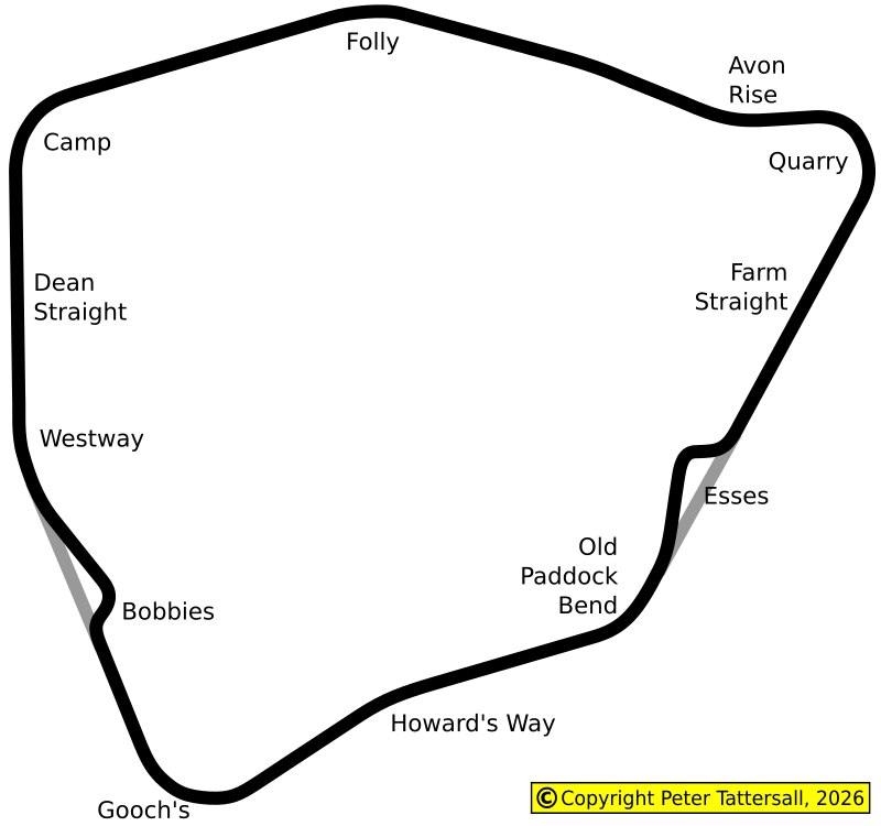 | Pit Lane | From the paddock, looking south towards the circuit, there are three buildings. The entry to the pit lane is between the middle building (Race Control) and the left hand building (Strawford Centre). From the circuit, the pit lane entry begins early, before Camp Corner, just by an extra tarmac wedge that is cut into the infield. It is a straight entry until alongside the start of Camp Corner and then turns tightly. You can still travel at racing speed, but it is very tight, so be careful. Head past Avon Bridge, on the left. Approaching the second building on the left, Race Control, get on the brakes for the gentle chicane, followed by the pitlane and its associated speed limit. Failing to get down to the speed limit of 60kph (37mph) will very likely result in a speed-gun-imposed penalty. |