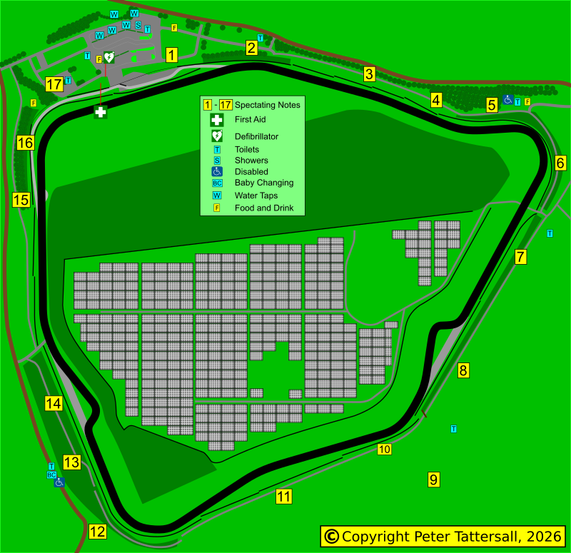 | Assembly Area | Looking towards the pits from the paddock, there are three buildings that run along the edge of the paddock. Turn so that you are parallel to the circuit and pits, with the buildings on your left. The third of those buildings is the Media Centre and the Assembly Area is alongside it. From the Assembly Area, competitors will be directed into the pits where they will line up and await their release onto the circuit. For drivers who want to queue up early, before the current incumbents of the Assembly Area depart, they can usually queue from the the entrance, which is a little prior to the Media Centre, running back past the Strawford Centre. Just be careful not to hog the space, which is tight. Access, especially for emergency vehicles, must be maintained. |
